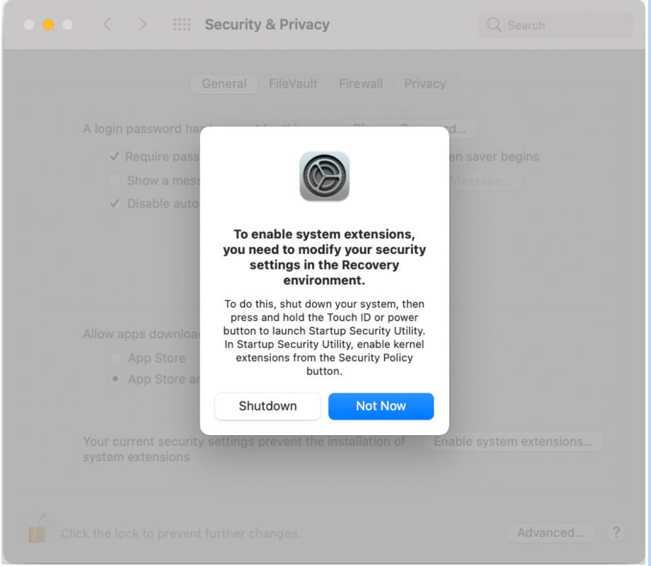 On Apple silicon-based Macs, system extensions are blocked by default. The system extensions will need to be enabled in MacOS recovery mode by following the steps below.