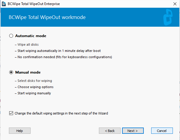 If you create it for 'Automatic' mode (the default option), all the connected drives will be automatically wiped just after loading BCWipe TWO.